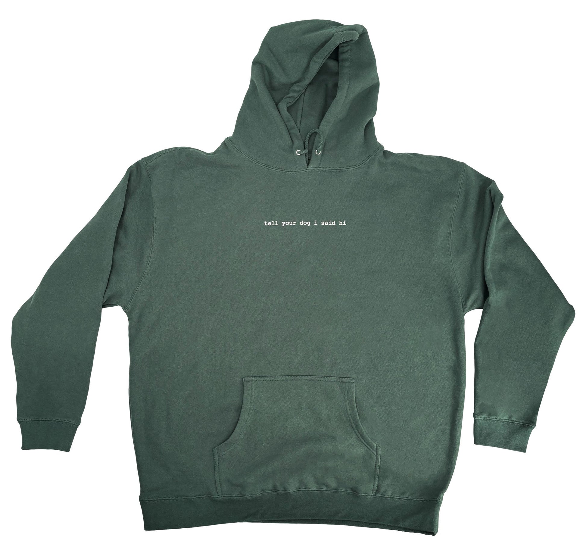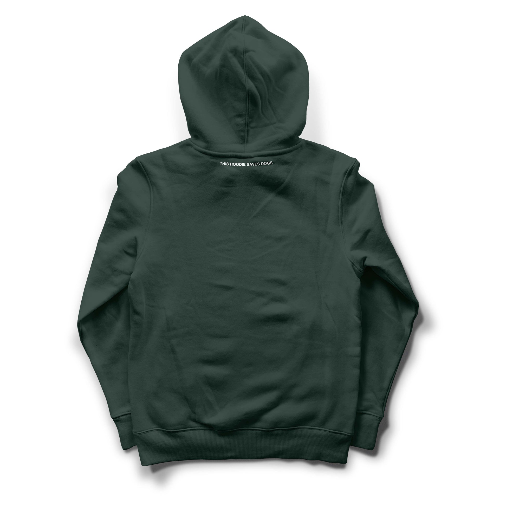 • "THIS HOODIE SAVES DOGS" in small print on the back (under the hood!)