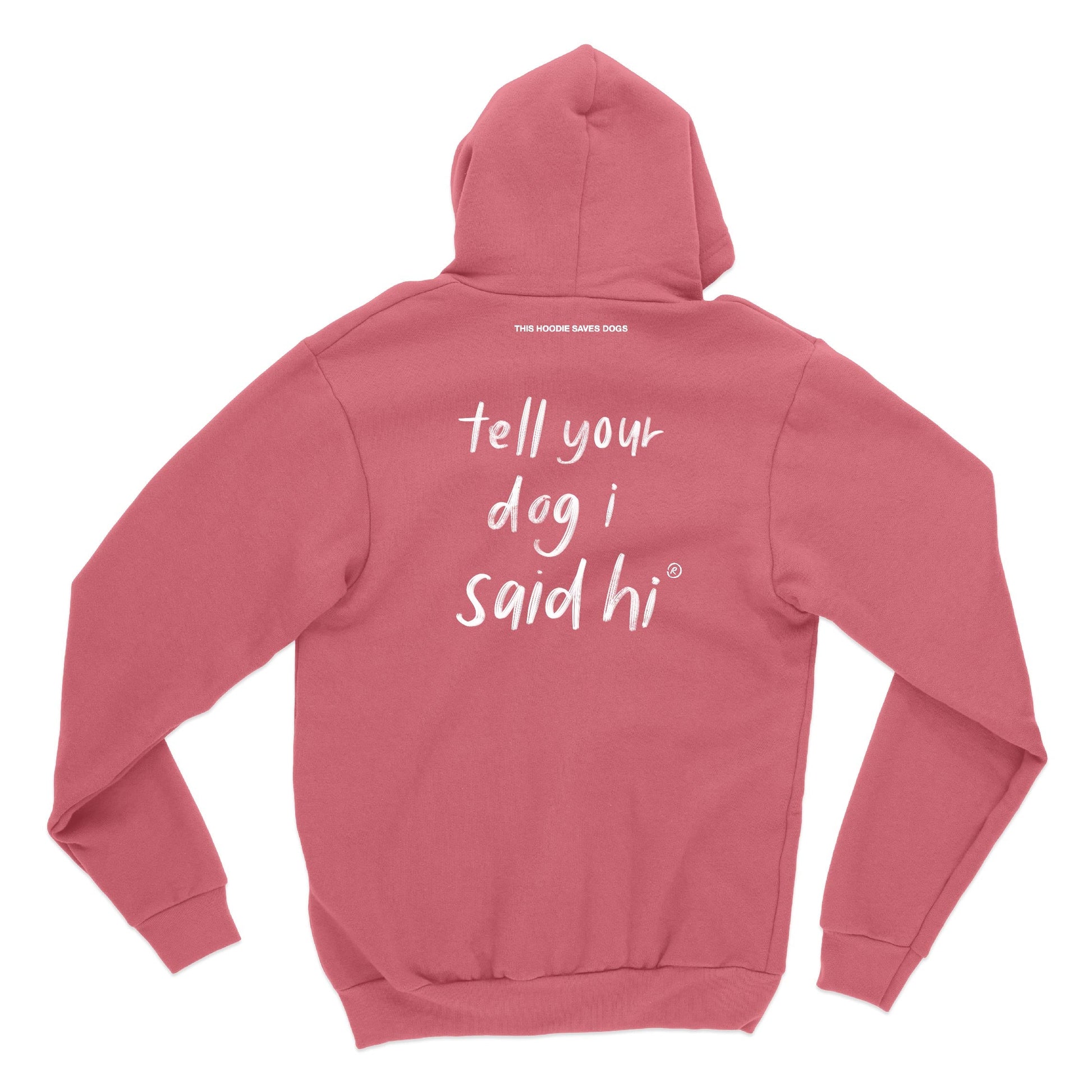 • "THIS HOODIE SAVES DOGS" in small print on the back (under the hood!)