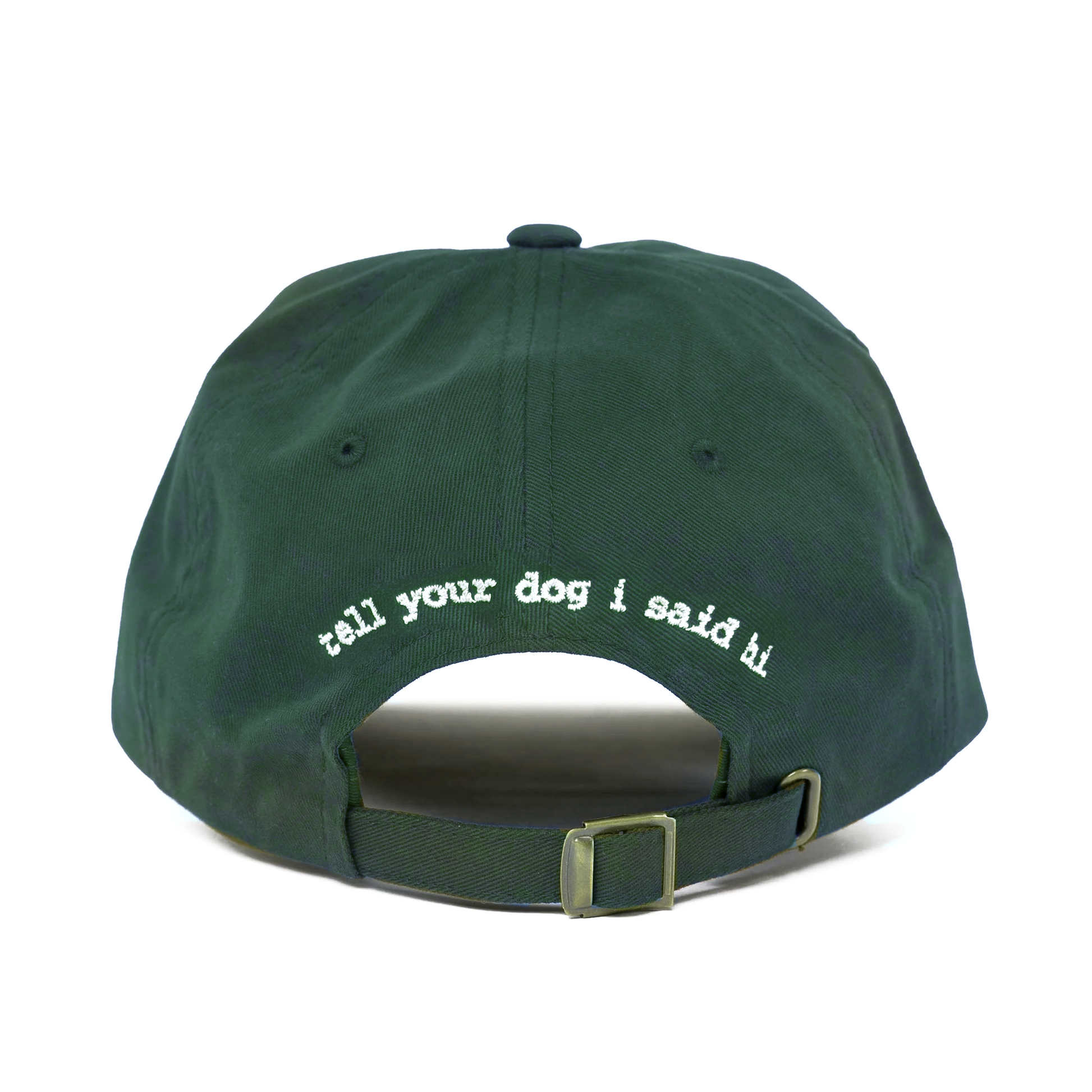 - "tell your dog i said hi®" embroidered across the front with Waving Dog image