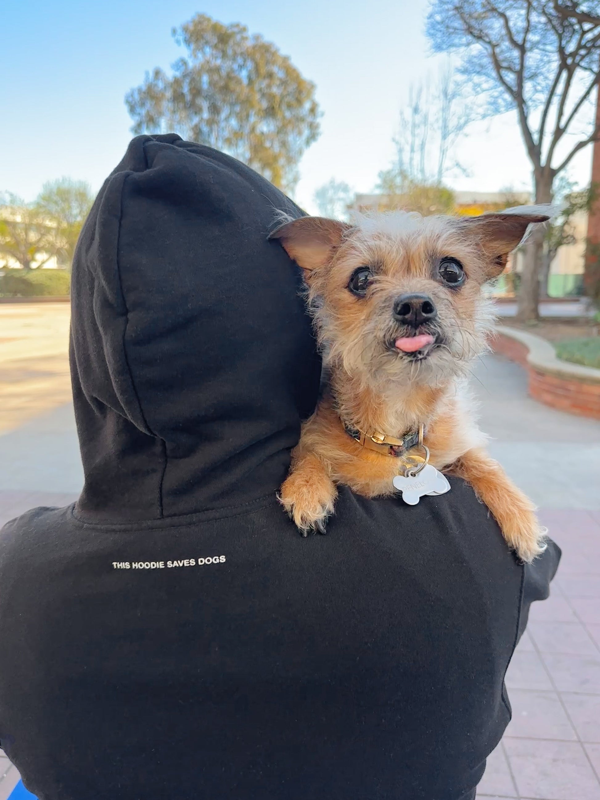 • "THIS HOODIE SAVES DOGS" in small print on the back (under the hood!)